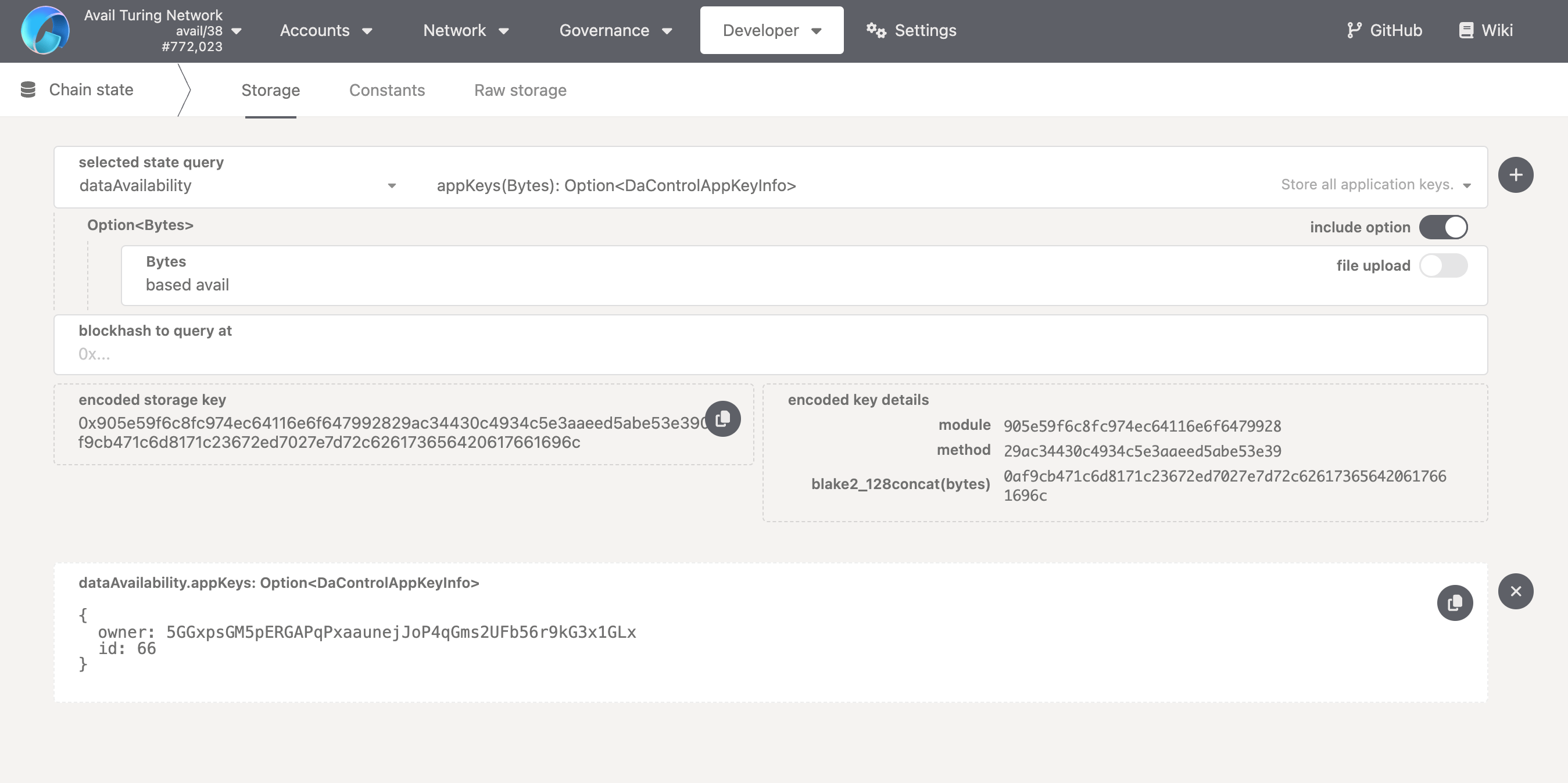 include optiontoggle, and enterbased availas thebytesinput. Call the function. What do you see? You will be returned a pair ofownerandid, which together with thekeyyou entered, form a uniqueappID.