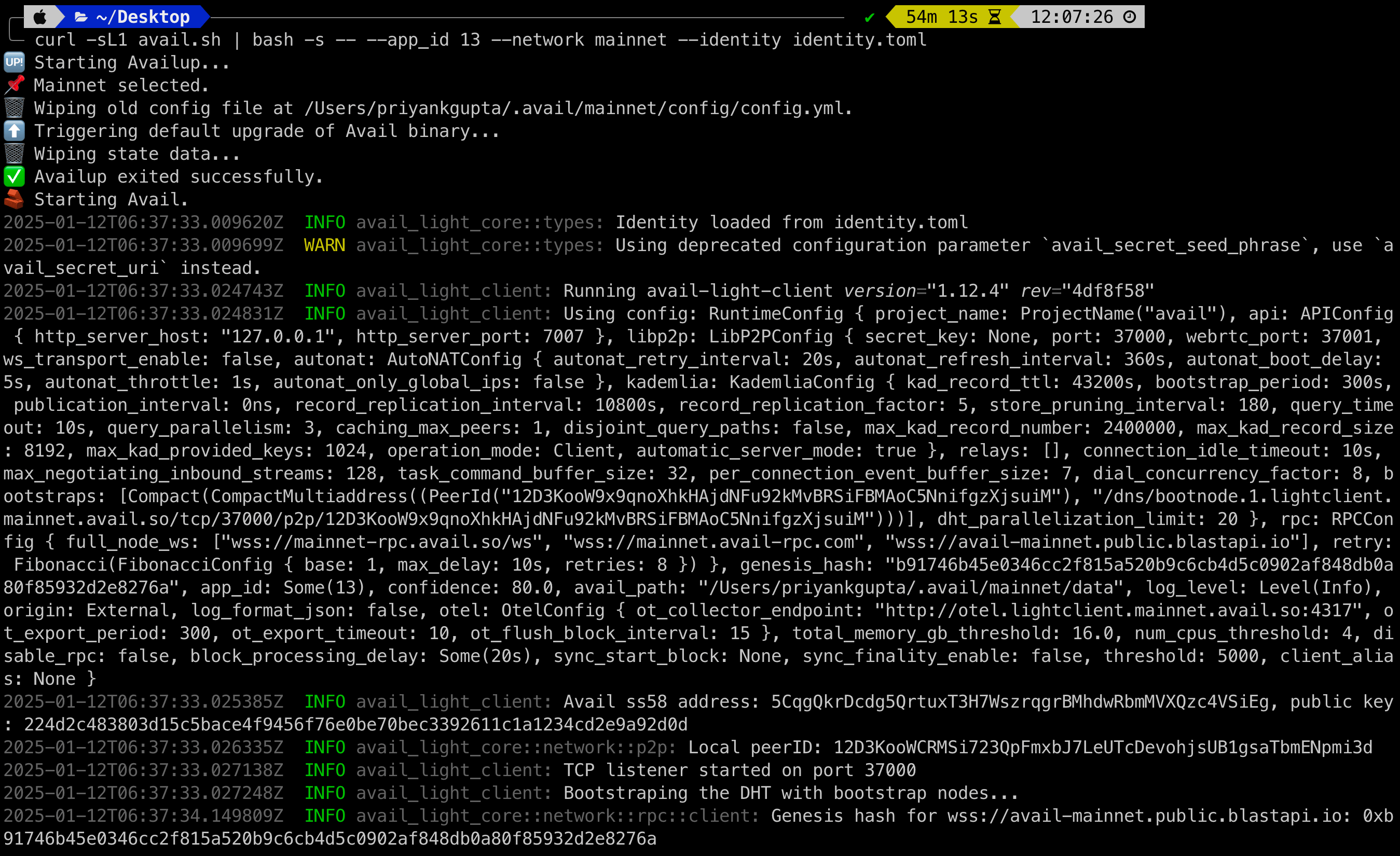 2024-03-20T10:50:25.528628Z INFO avail_light::light_client: Processing finalized block block_number=562690 block_delay=20 2024-03-20T10:50:25.528706Z INFO avail_light::light_client: Random cells generated: 10 block_number=562690 cells_requested=10 2024-03-20T10:50:26.069497Z INFO avail_light::network: Cells fetched from DHT block_number=562690 cells_total=10 cells_fetched=0 cells_verified=0 fetch_elapsed=540.755792ms proof_verification_elapsed=2.208ยตs 2024-03-20T10:50:28.322706Z INFO avail_light::network: Cells fetched from RPC block_number=562690 cells_total=10 cells_fetched=10 cells_verified=10 fetch_elapsed=2.232714917s proof_verification_elapsed=20.404208ms 2024-03-20T10:50:28.322987Z INFO avail_light::light_client: Confidence factor: 99.90234375 block_number=562690 confidence=99.90234375 2024-03-20T10:50:28.323134Z INFO avail_light::light_client: Sleeping for 14.61143875s seconds 2024-03-20T10:50:28.323154Z INFO avail_light::api::v2: Message published to clients topic=ConfidenceAchieved published=0 failed=0 2024-03-20T10:50:28.859369Z INFO avail_light::network::p2p::event_loop: Cell upload success rate for block 562690: 0/10. Duration: 0 2024-03-20T10:50:41.535425Z INFO avail_light::network::rpc::subscriptions: New justification at block no.: 562692, hash: 0x3b602253298ce9bec9b5b8f0c8767f14502ccaa17a003dfba77f9d90edeaf5da 2024-03-20T10:50:41.709011Z INFO avail_light::network::rpc::subscriptions: Header no.: 562692 2024-03-20T10:50:41.709557Z INFO avail_light::network::rpc::subscriptions: Number of matching signatures: 5/7 for block 562692, set_id 223 2024-03-20T10:50:41.709574Z INFO avail_light::network::rpc::subscriptions: Storing finality checkpoint at block 562692 2024-03-20T10:50:41.709908Z INFO avail_light::network::rpc::subscriptions: Sending finalized block 562692 2024-03-20T10:50:41.709966Z INFO avail_light::api::v2: Message published to clients topic=HeaderVerified published=0 failed=0 2024-03-20T10:50:42.936699Z INFO avail_light::light_client: Processing finalized block block_number=562691 block_delay=20 2024-03-20T10:50:42.936761Z INFO avail_light::light_client: Random cells generated: 10 block_number=562691 cells_requested=10 2024-03-20T10:50:43.472932Z INFO avail_light::network: Cells fetched from DHT block_number=562691 cells_total=10 cells_fetched=0 cells_verified=0 fetch_elapsed=536.136083ms proof_verification_elapsed=3.042ยตs 2024-03-20T10:50:46.513570Z INFO avail_light::network: Cells fetched from RPC block_number=562691 cells_total=10 cells_fetched=10 cells_verified=10 fetch_elapsed=3.022786041s proof_verification_elapsed=17.810542ms 2024-03-20T10:50:46.513706Z INFO avail_light::light_client: Confidence factor: 99.90234375 block_number=562691 confidence=99.90234375 2024-03-20T10:50:46.513785Z INFO avail_light::light_client: Sleeping for 15.195224667s seconds 2024-03-20T10:50:46.513795Z INFO avail_light::api::v2: Message published to clients topic=ConfidenceAchieved published=0 failed=0 2024-03-20T10:50:47.056255Z INFO avail_light::network::p2p::event_loop: Cell upload success rate for block 562691: 0/10. Duration: 0