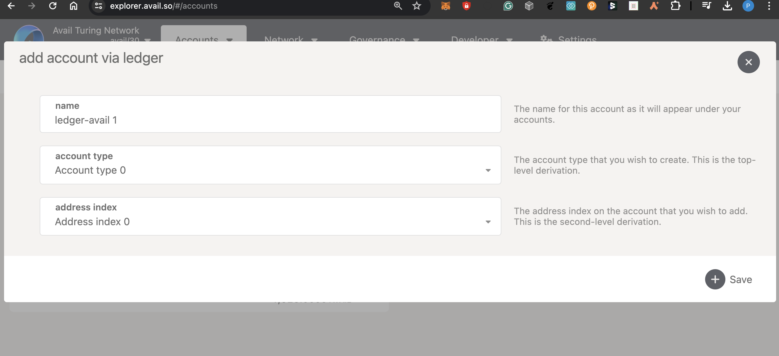 Any account address generated from your ledger will be a unique combination of your ledger-device’s seed phrase, the top-level derivation, and the second-level derivation. This means if you re-connect to the avail apps explorer with the same ledger device in the future (that has not been reset), and use the same top-level and second-level derivations, you will get the same account address.