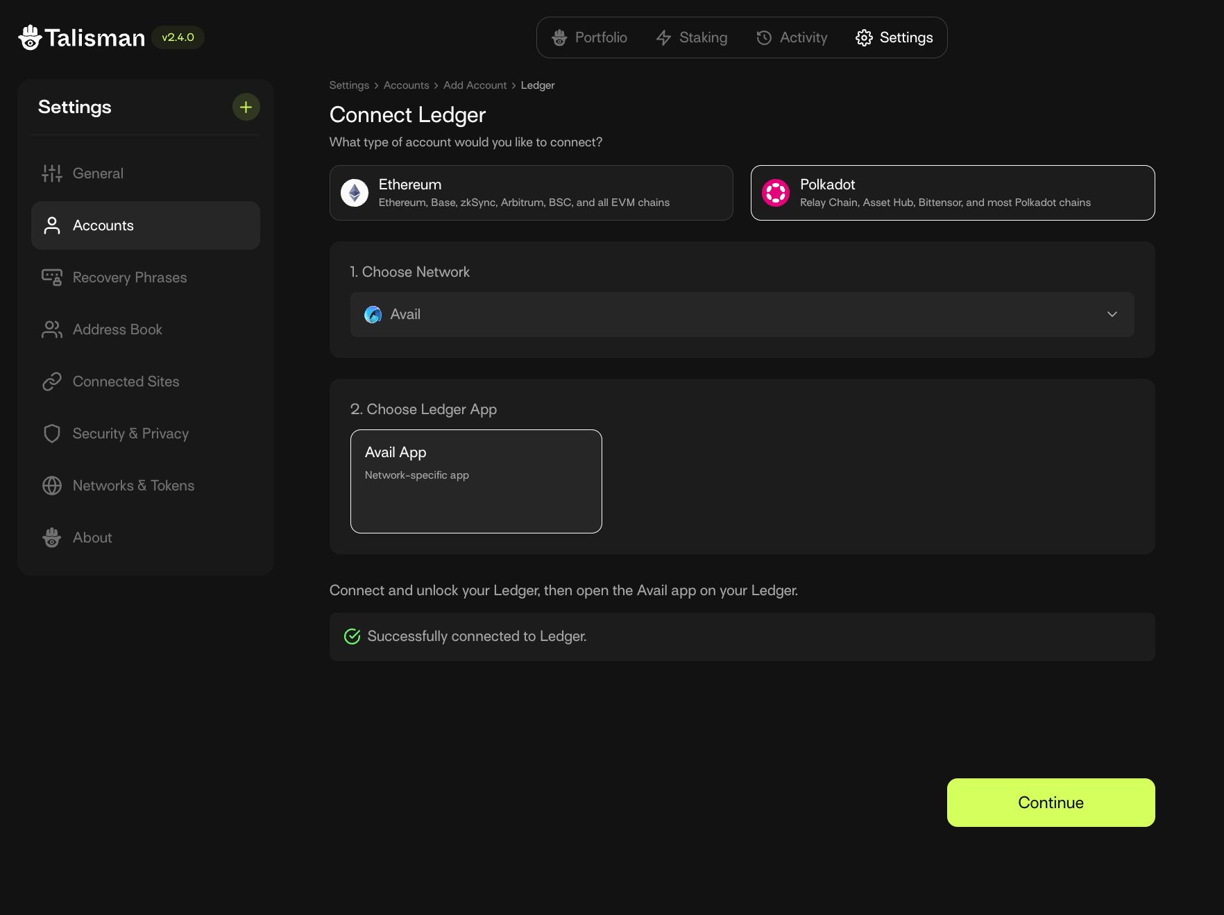 If you have set up your ledger device and want to use it through a dedicated Avail wallet, this section is for you. We have included instructions for connecting a ledger account with Subwallet & Talisman, but the process is similar for other wallets.