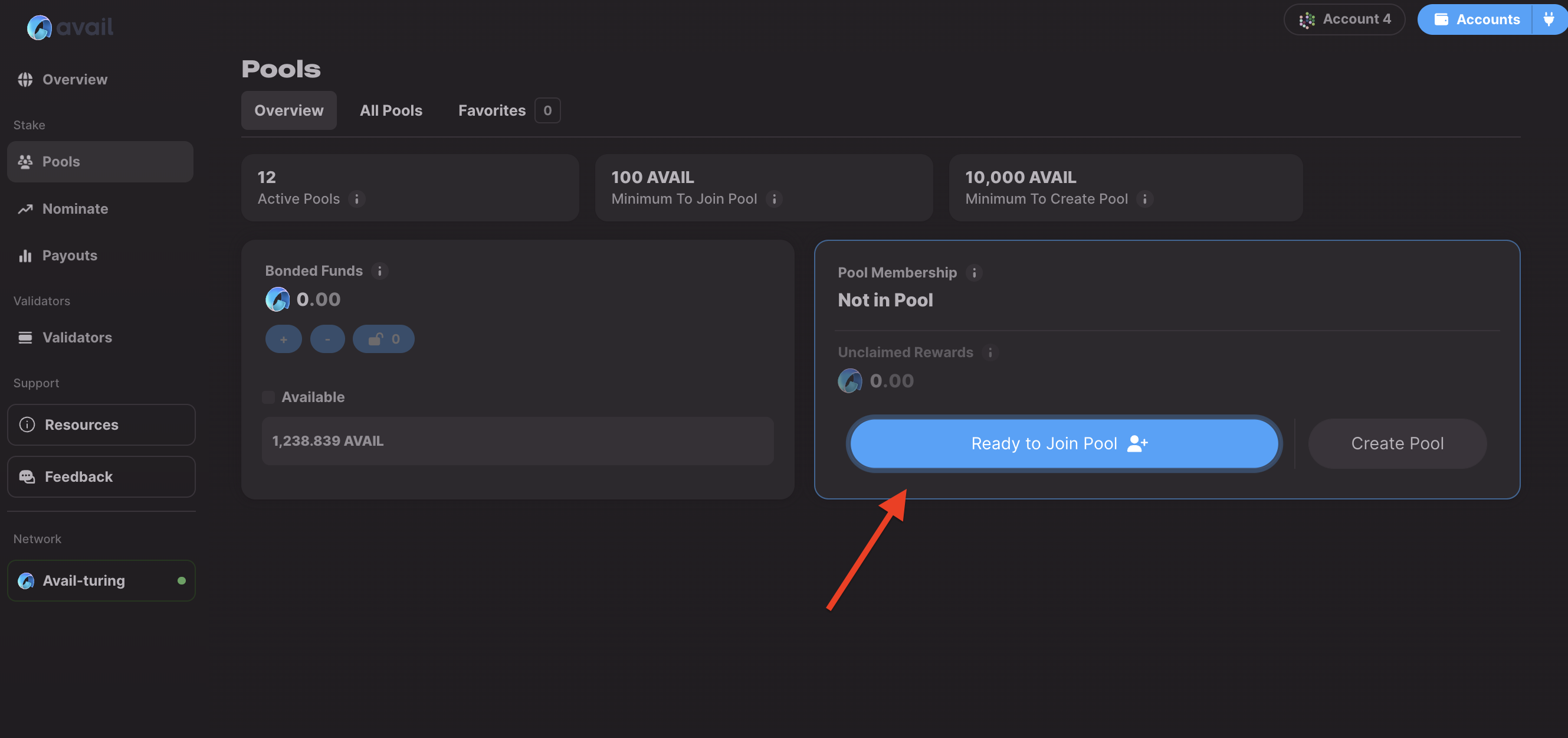 Go to the Pools tab from the left sidebar, and click on the Ready to Join Pool button.